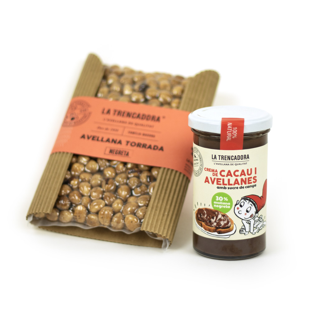 Crema d’avellana amb el 30% de contingut de pasta de varietat Negreta pura i amb cacau d’alta qualitat i un toc de vainilla Bourbon de Madagascar per arrodonir la fórmula.